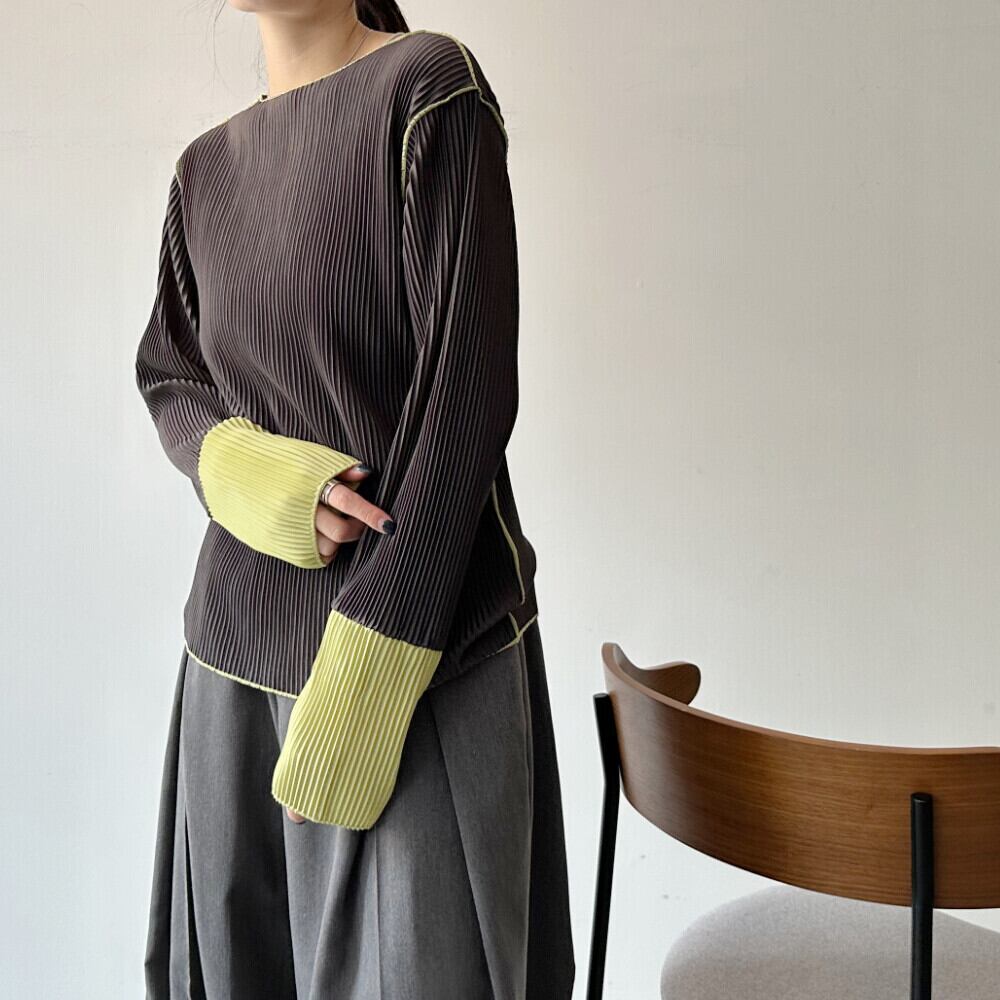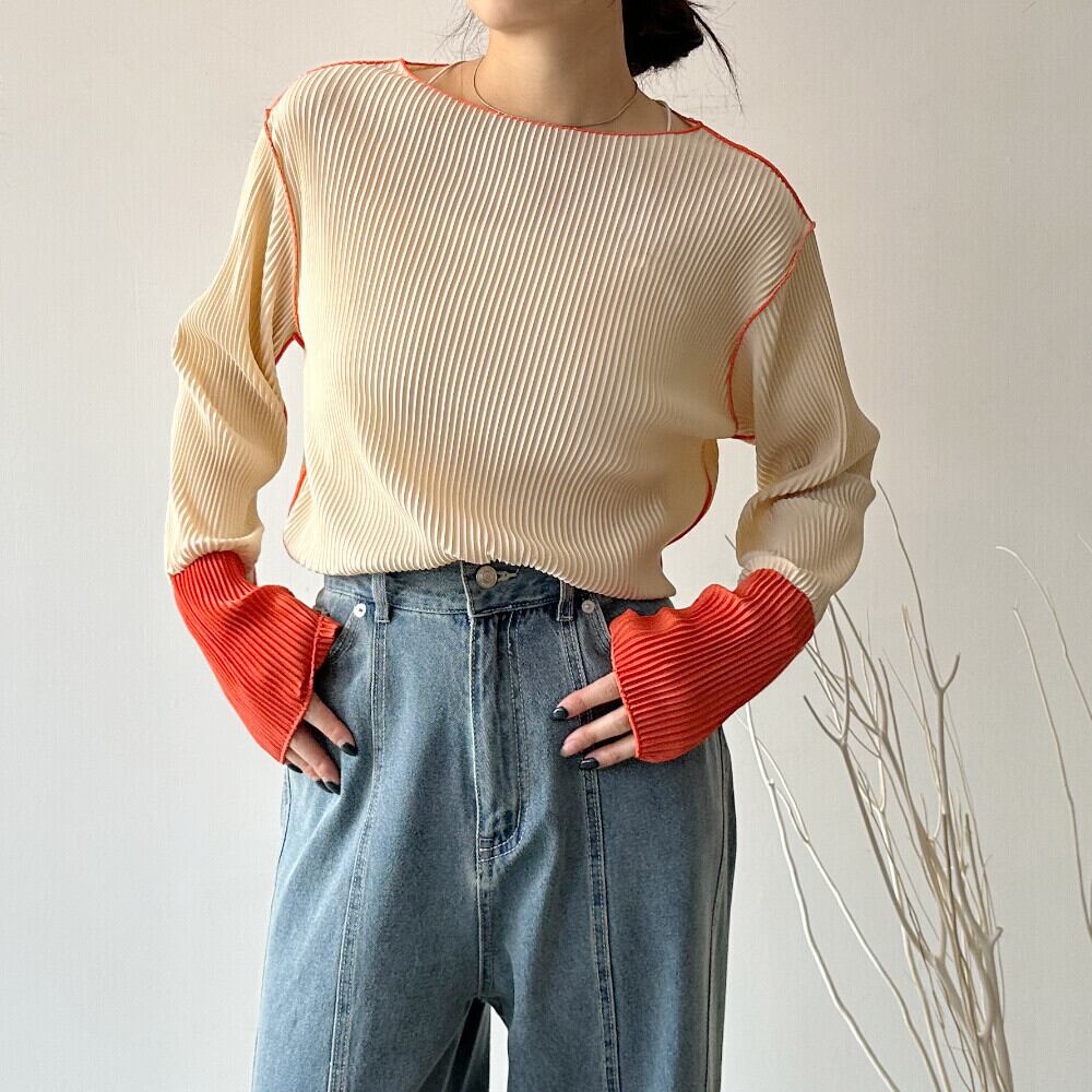 こちらのアイテムは、2025年春新作のプリーツ加工配色袖トップスです!ユニークなプリーツ加工と配色の袖が特徴で、カジュアルな日常使いや特別なシーンまで幅広く活躍することが期待できるスタイリッシュなトップスです◎