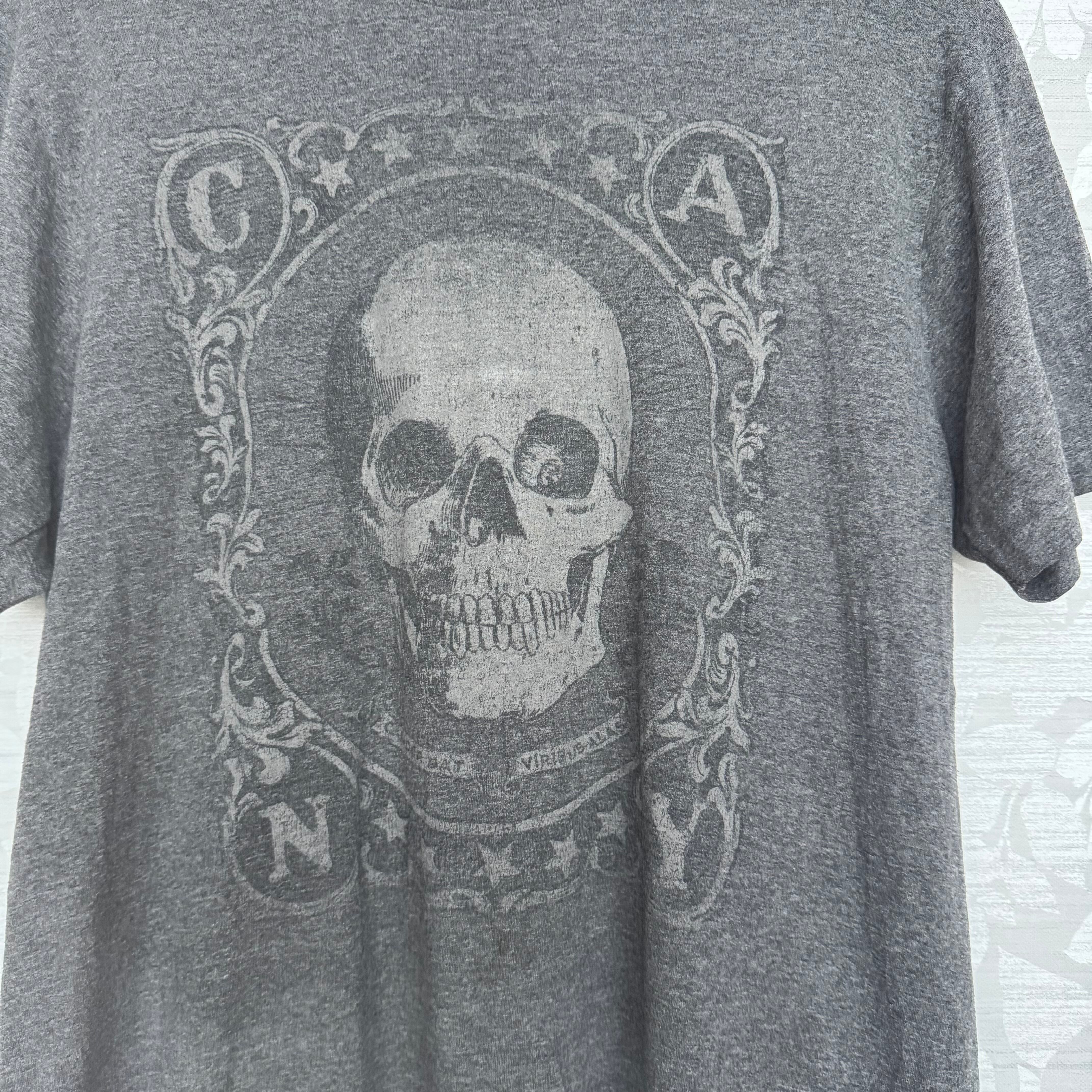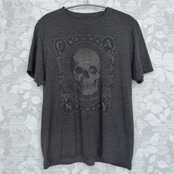 ・ダークグレーのボディに、インパクトのあるスカル(ドクロ)のグラフィックプリントが施されています。