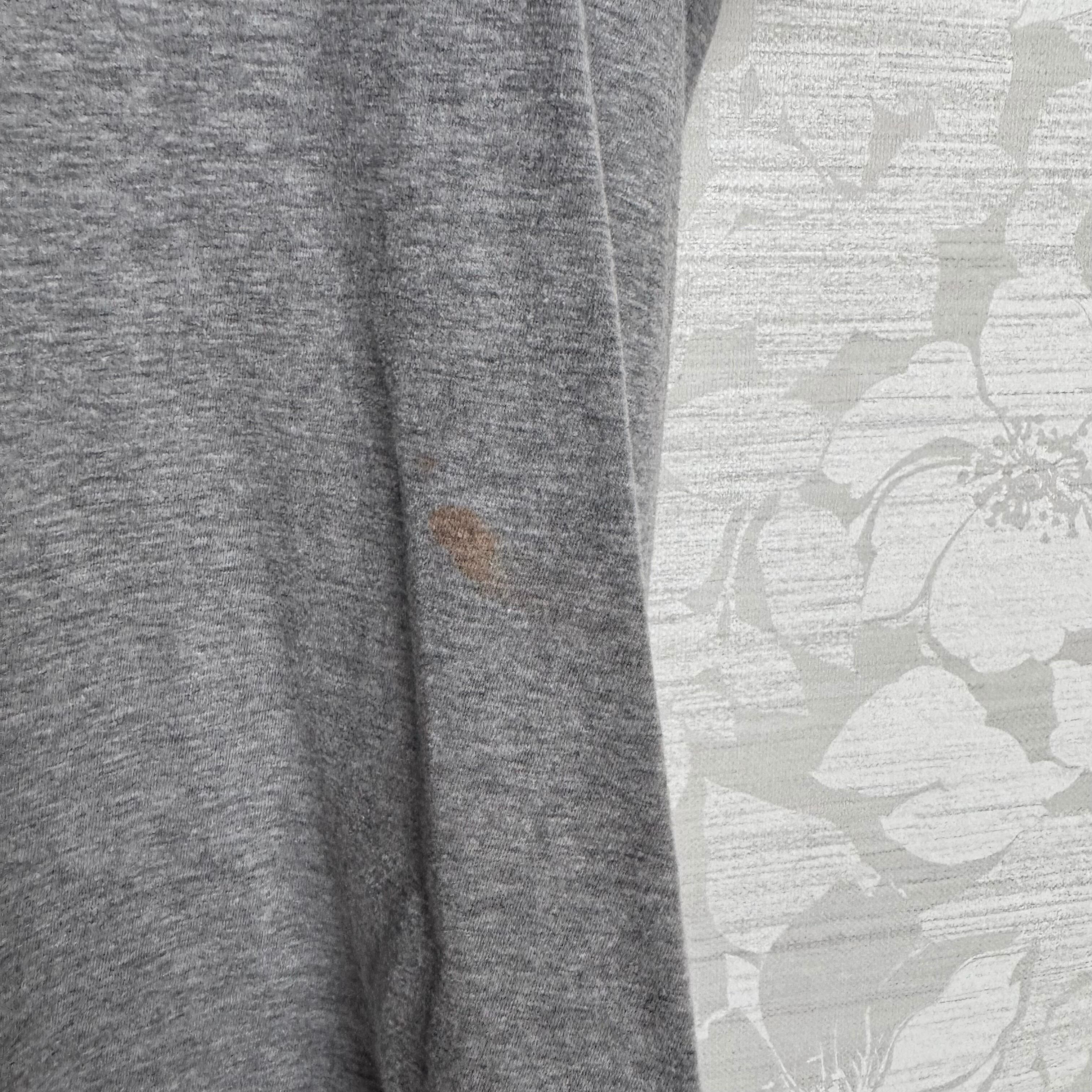 右袖(着用時)に茶色いシミがあります(画像6をご確認ください)。全体的に着用に伴う若干の使用感や毛羽立ち、プリントのかすれが見られます。その他、目立つ大きな汚れやダメージはなく、まだまだご着用いただける状態です。
