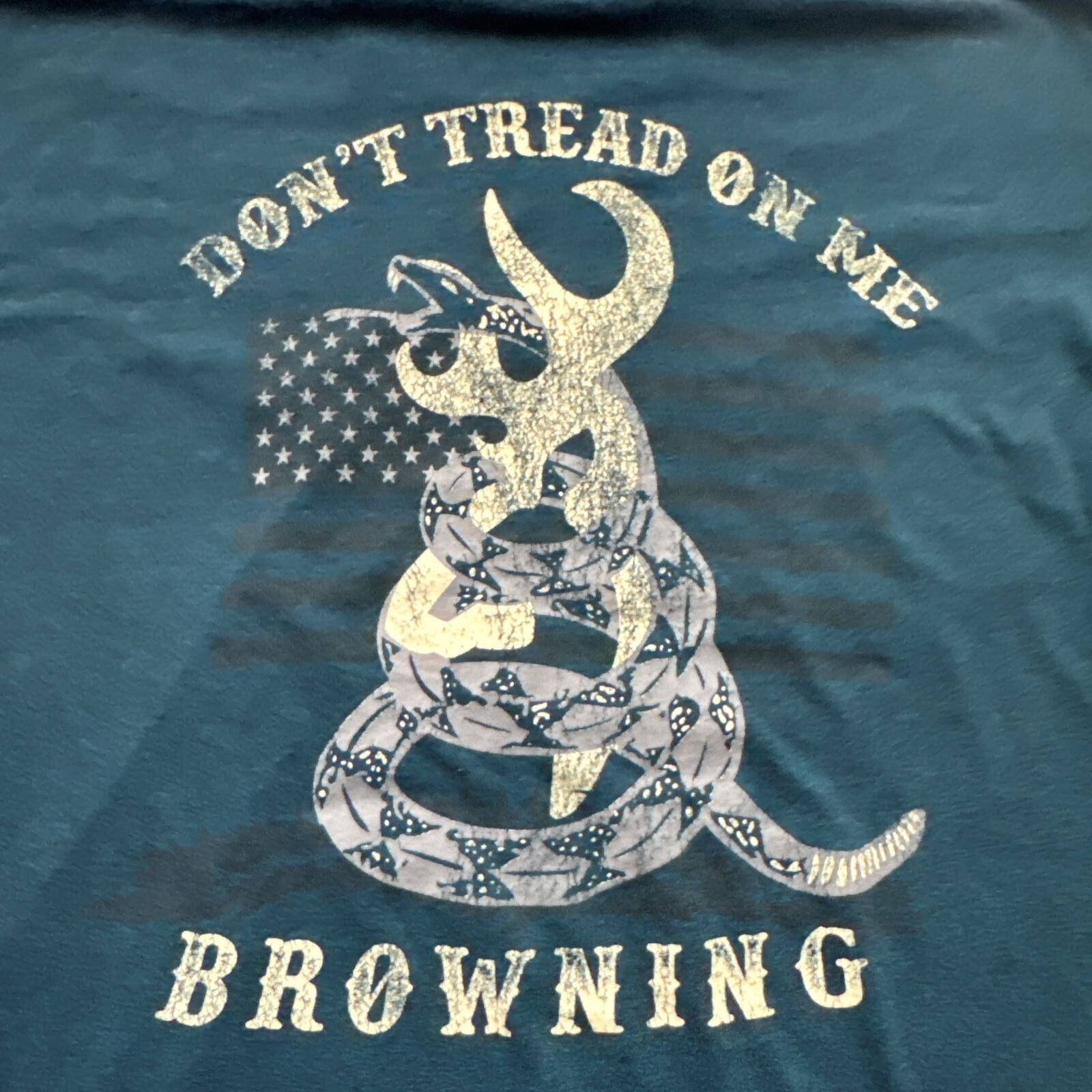 ・前面はブランドロゴのみのシンプルなデザインですが、背面には迫力あるガラガラヘビや銃器、星条旗を組み合わせたグラフィックが大胆にプリントされています。