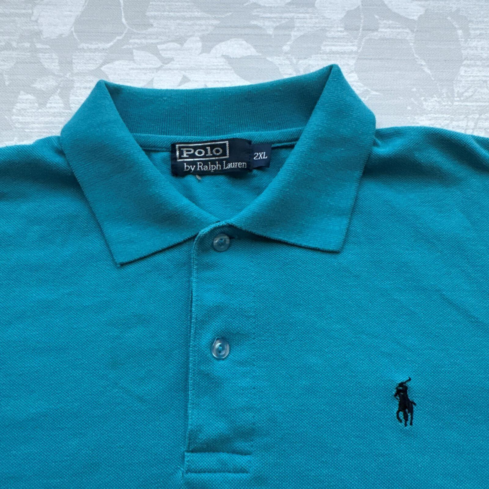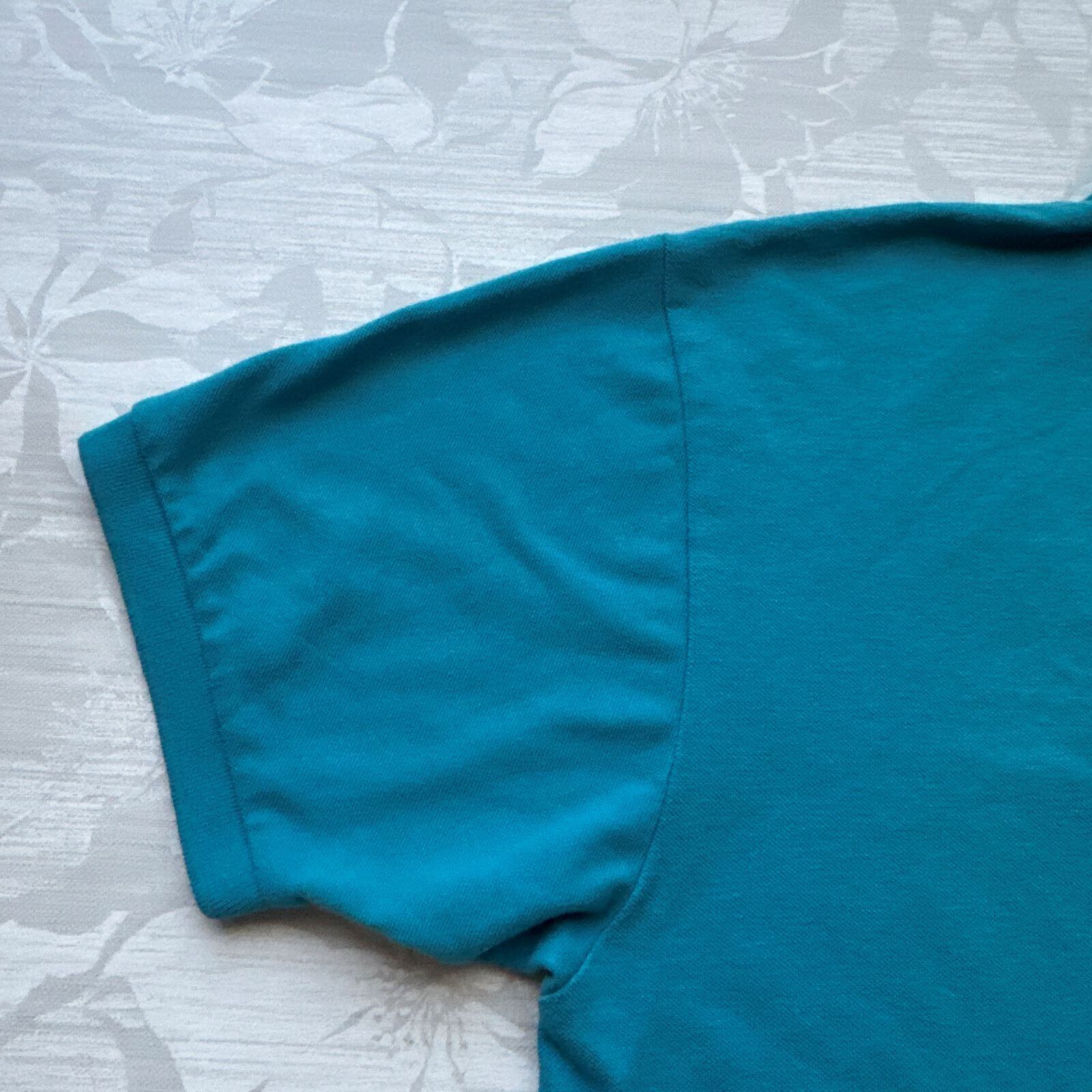 •鮮やかなターコイズブルー(またはティール)系のカラーが特徴のポロシャツです。