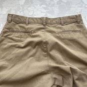 前面太もも付近にシミ、および他の箇所にも小さな汚れが見られます。また、背面ポケットの玉縁(ふち)部分に一部ホツレ/破れが見られます。