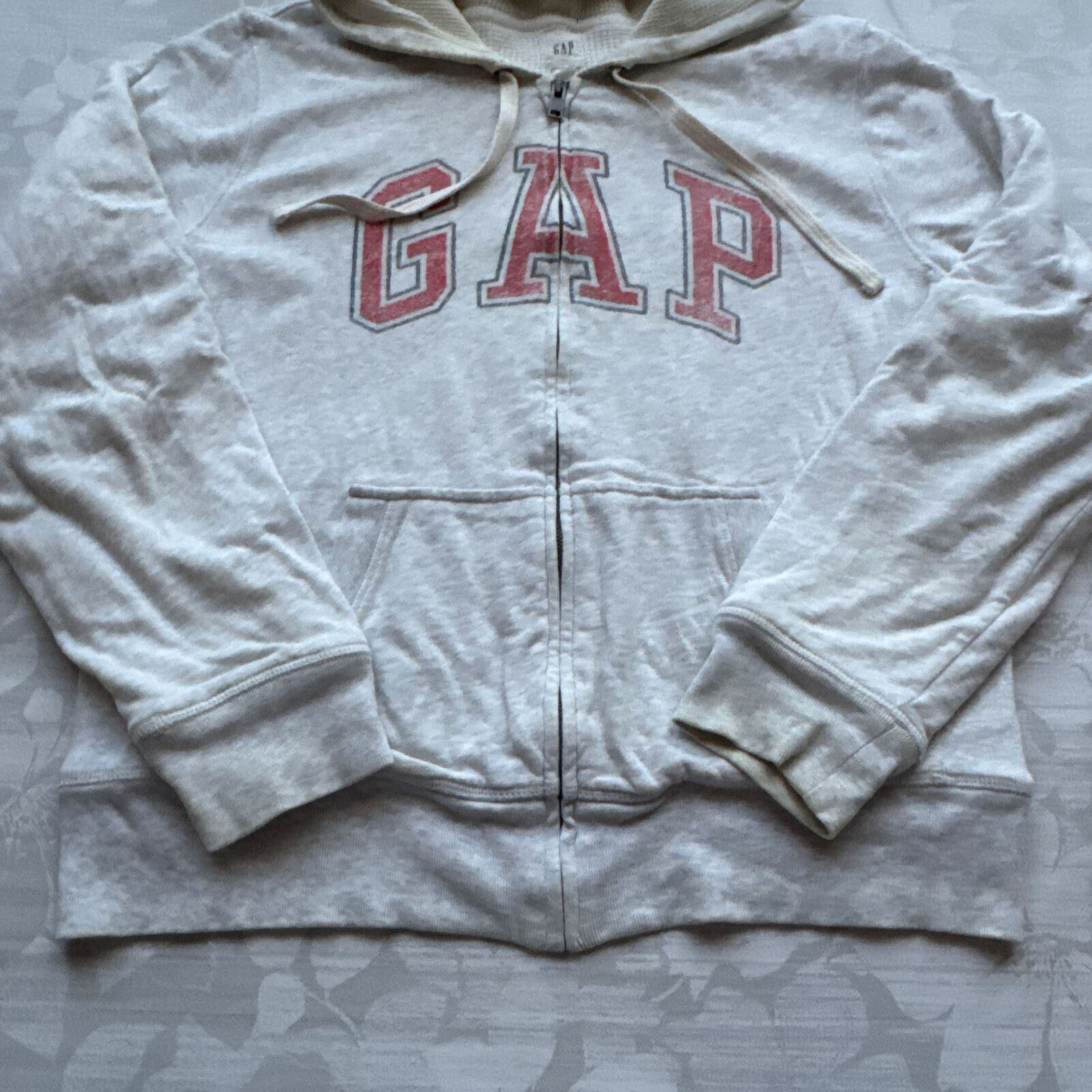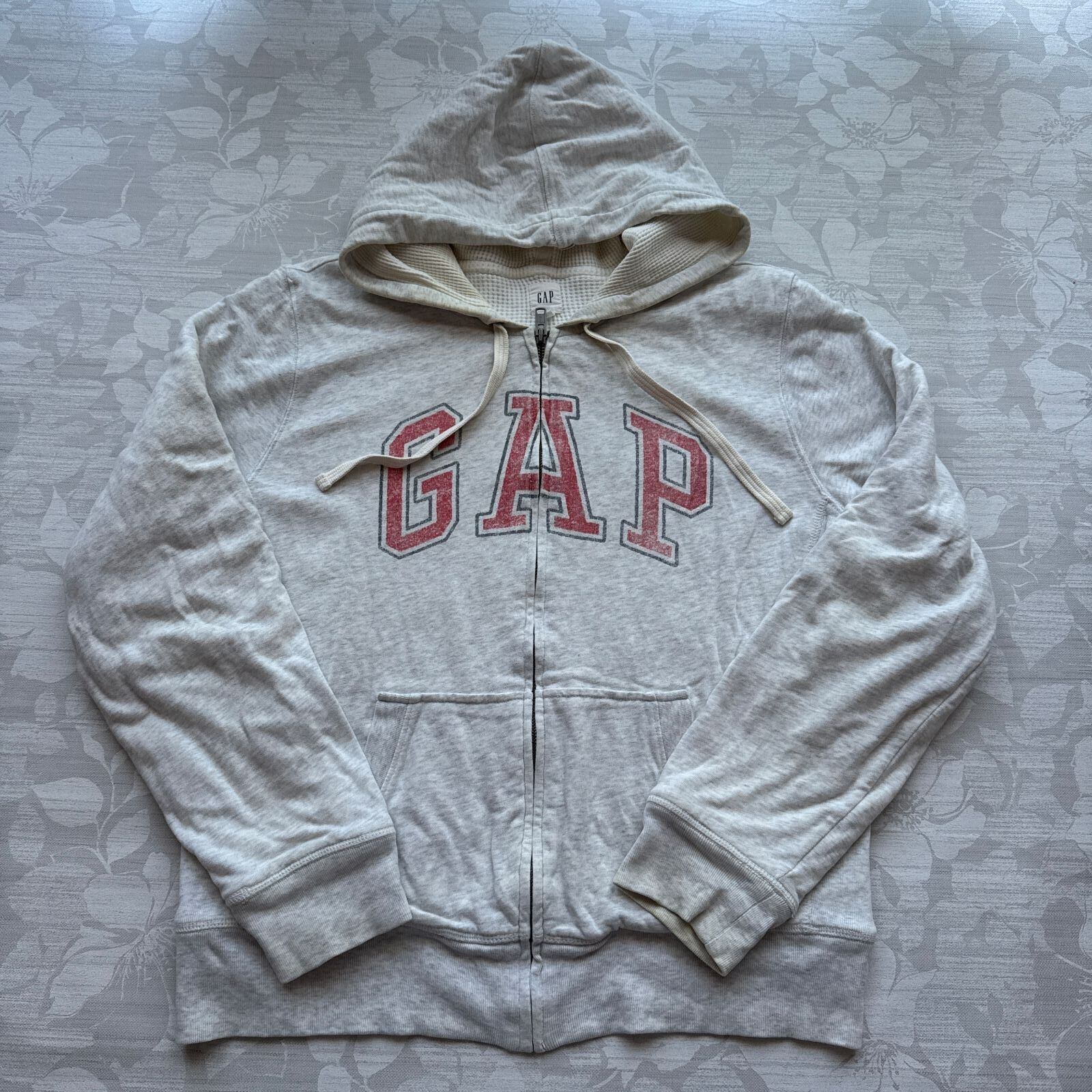 •定番人気ブランドGAPのカジュアルなフルジップパーカーです。着回しのしやすい霜降りグレーのボディに、ヴィンテージ風のロゴプリントが施されています。